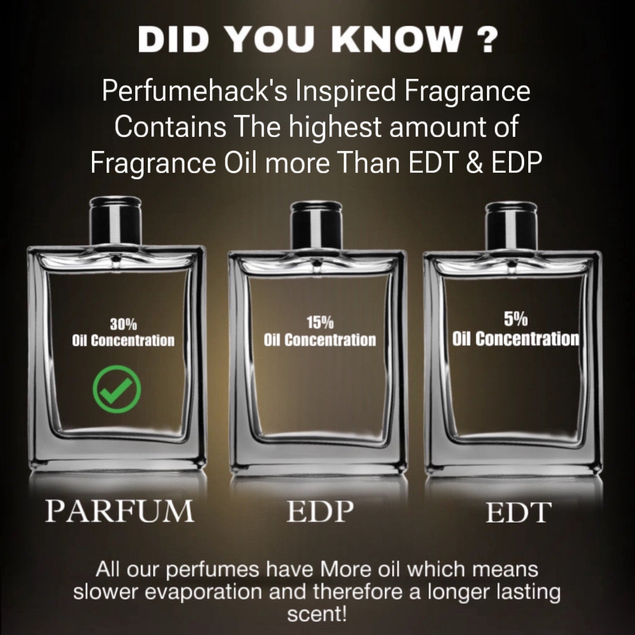 There is over 40 % of concentrated oil in perfumes which makes it Extrait de Parfum, Parfum-This has the highest concentration of fragrance compounds therefore will likely last the longest and have the strongest projection.